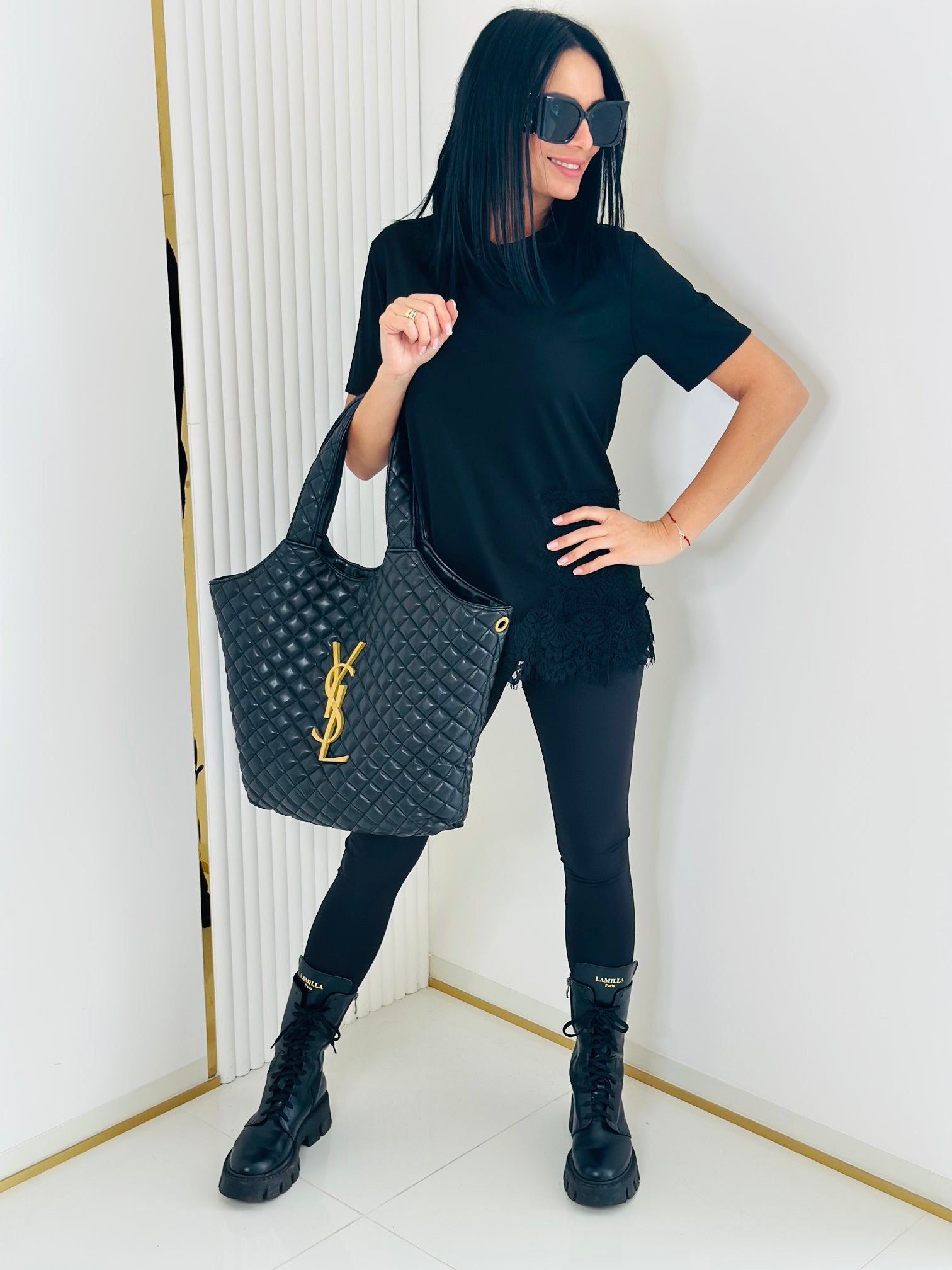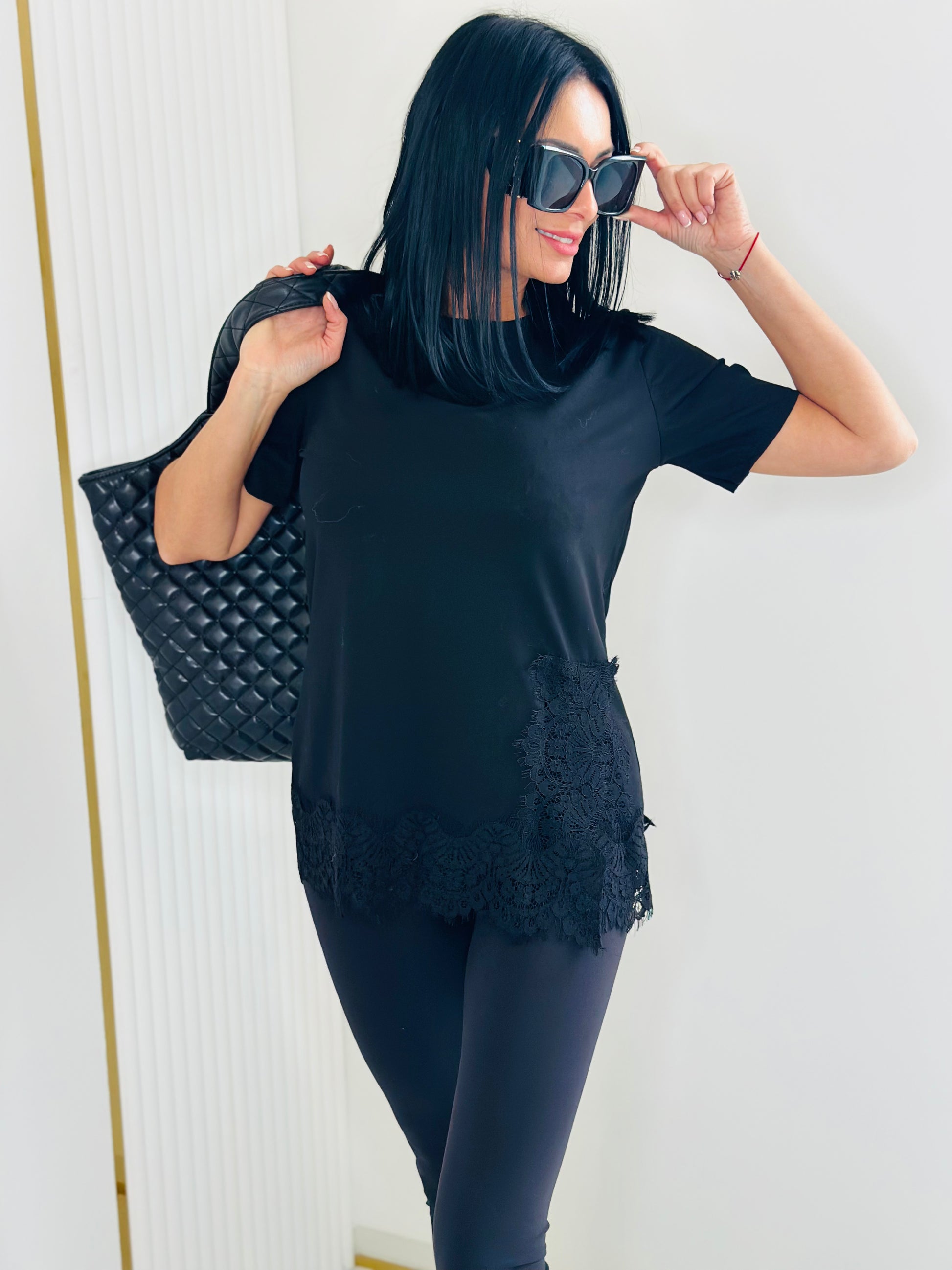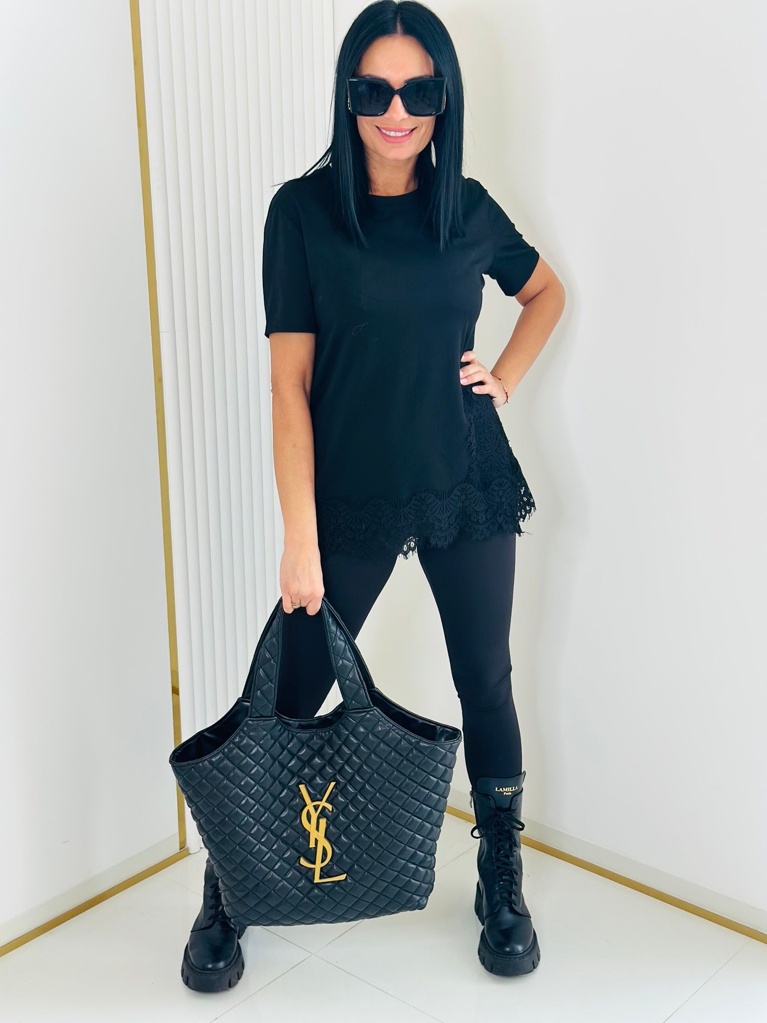 Ta bluzka to ulepszony basic, który łączy w sobie klasyczną wygodę T-shirtu z nutą zmysłowej elegancji. Luźny, swobodny krój kontrastuje z bogatym, koronkowym wykończeniem, tworząc idealny element do wielu stylizacji – od casualowych po romantyczne.