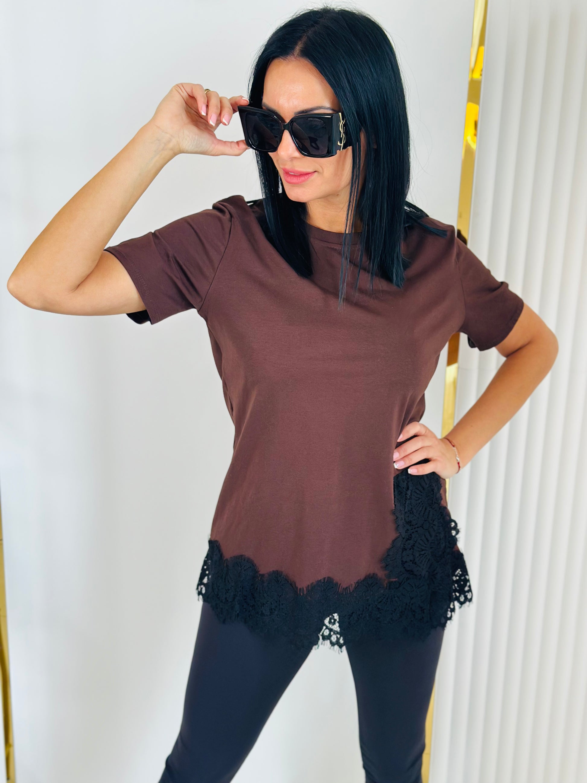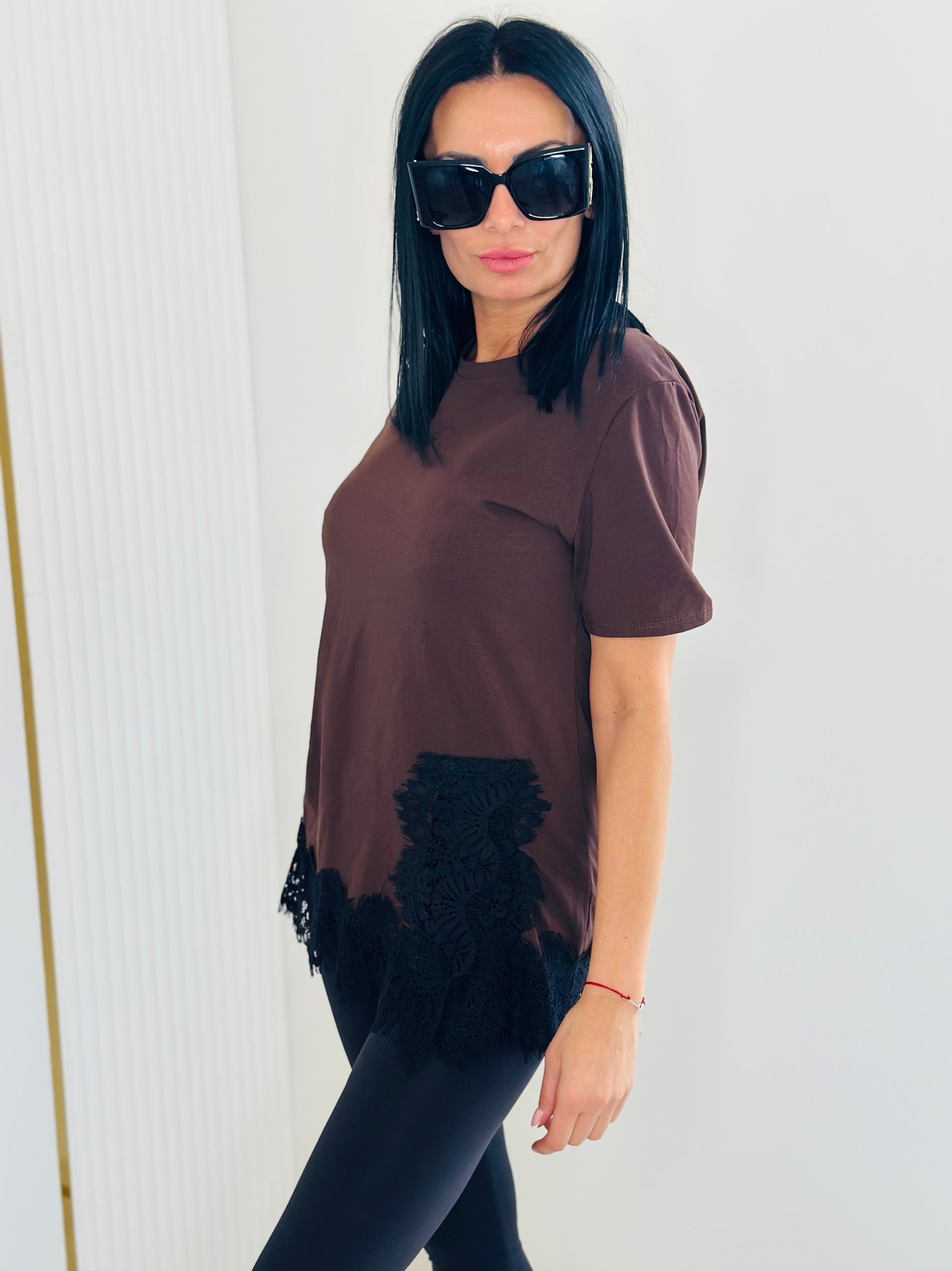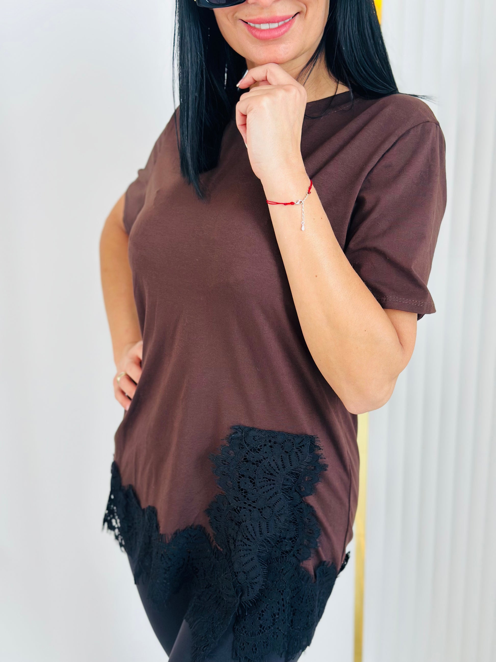 Bluzka T-Shirt z Koronkowym Wykończeniem