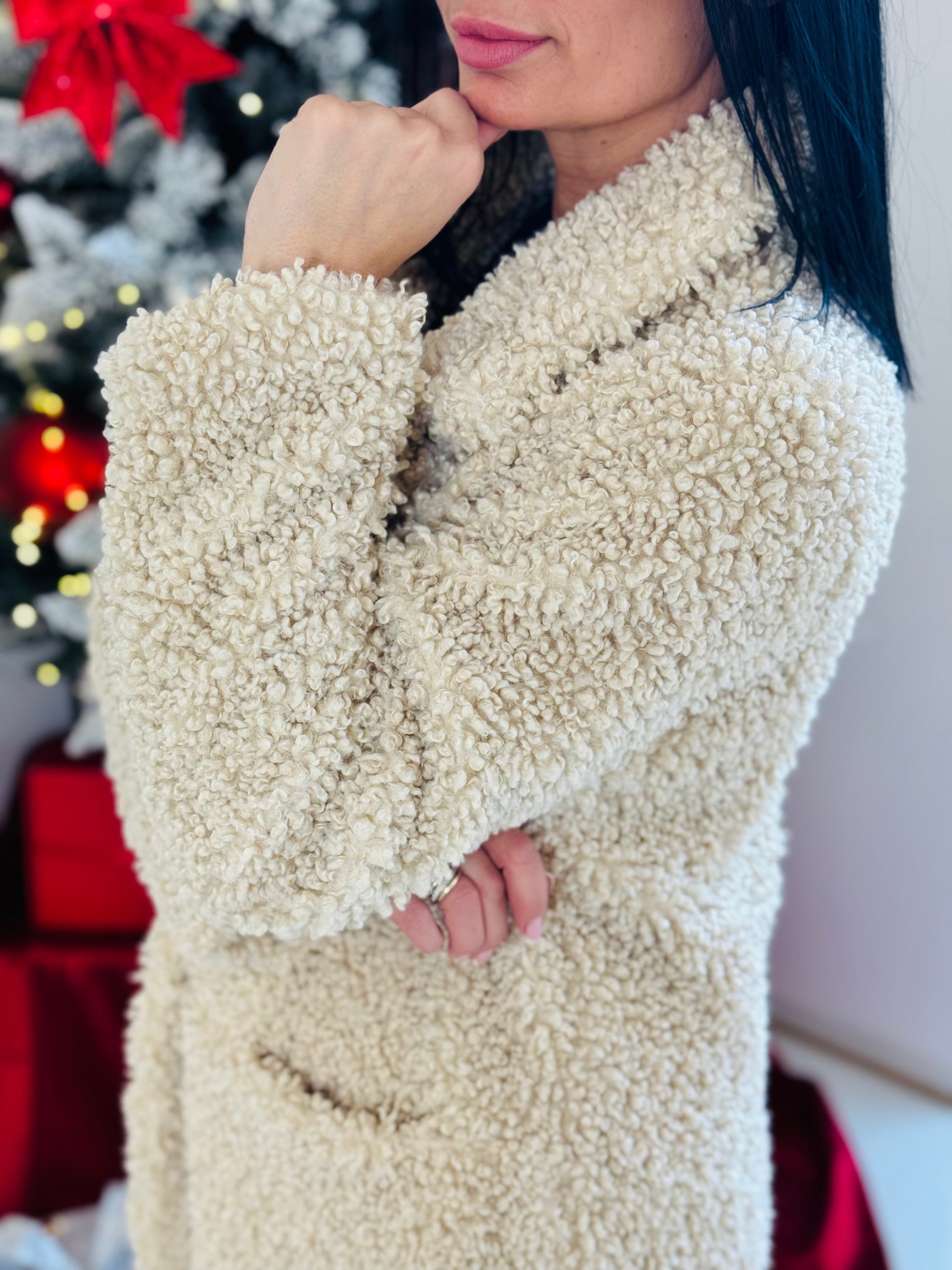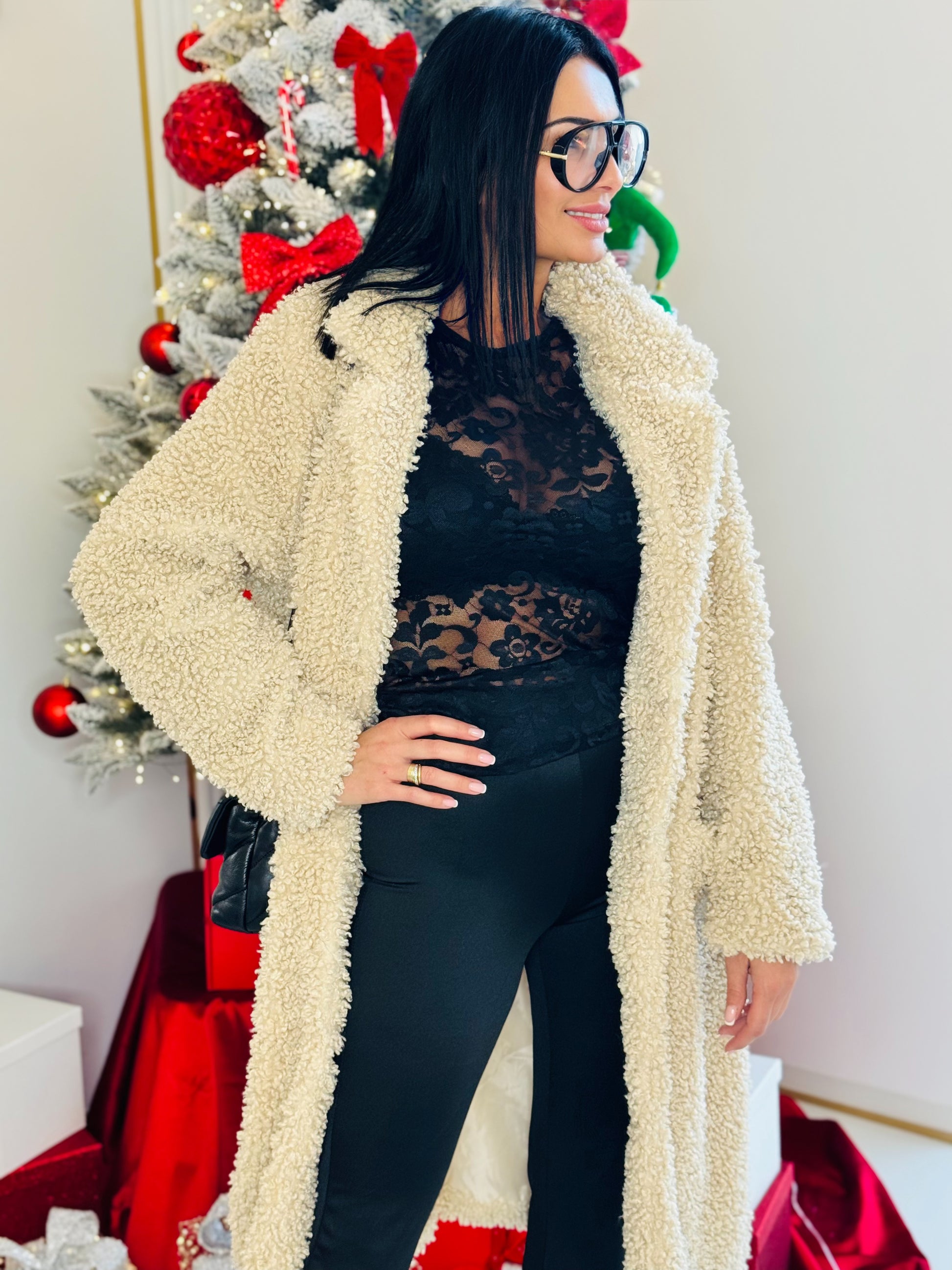 Absolutny hit sezonu! Ten długi płaszcz to definicja luksusu i ciepła w stylu cozy. Wykonany z niezwykle puszystego i miękkiego futerka imitującego wełnę baranka, jest idealny na chłodne dni. Dodaje stylizacjom nonszalancji i miękkości.