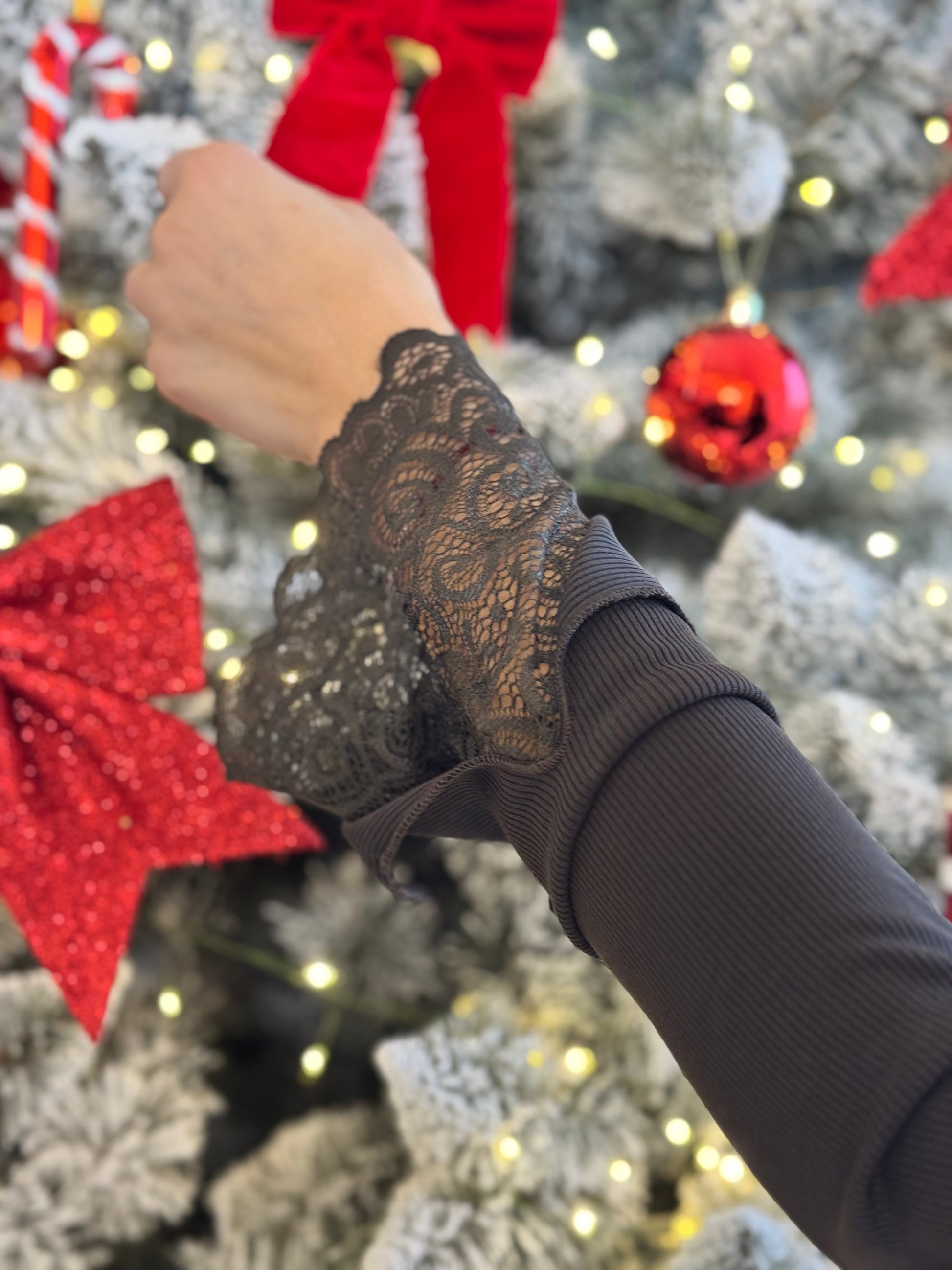 Rękawy: Długie rękawy, których mankiety zakończone są delikatną, ozdobną koronką. Koronka wystaje dyskretnie poza brzeg rękawa, dodając stylizacji romantycznego i oryginalnego charakteru.