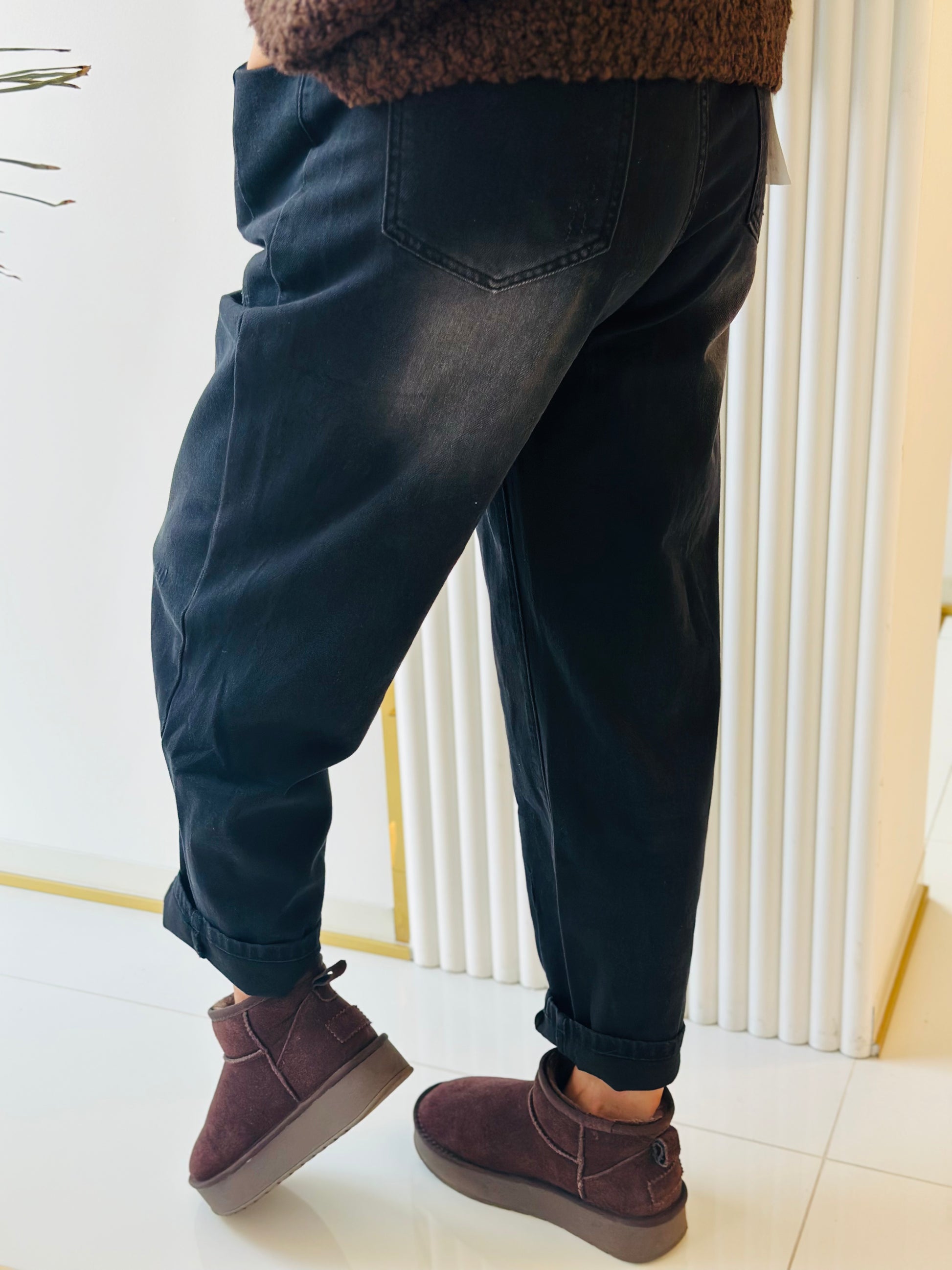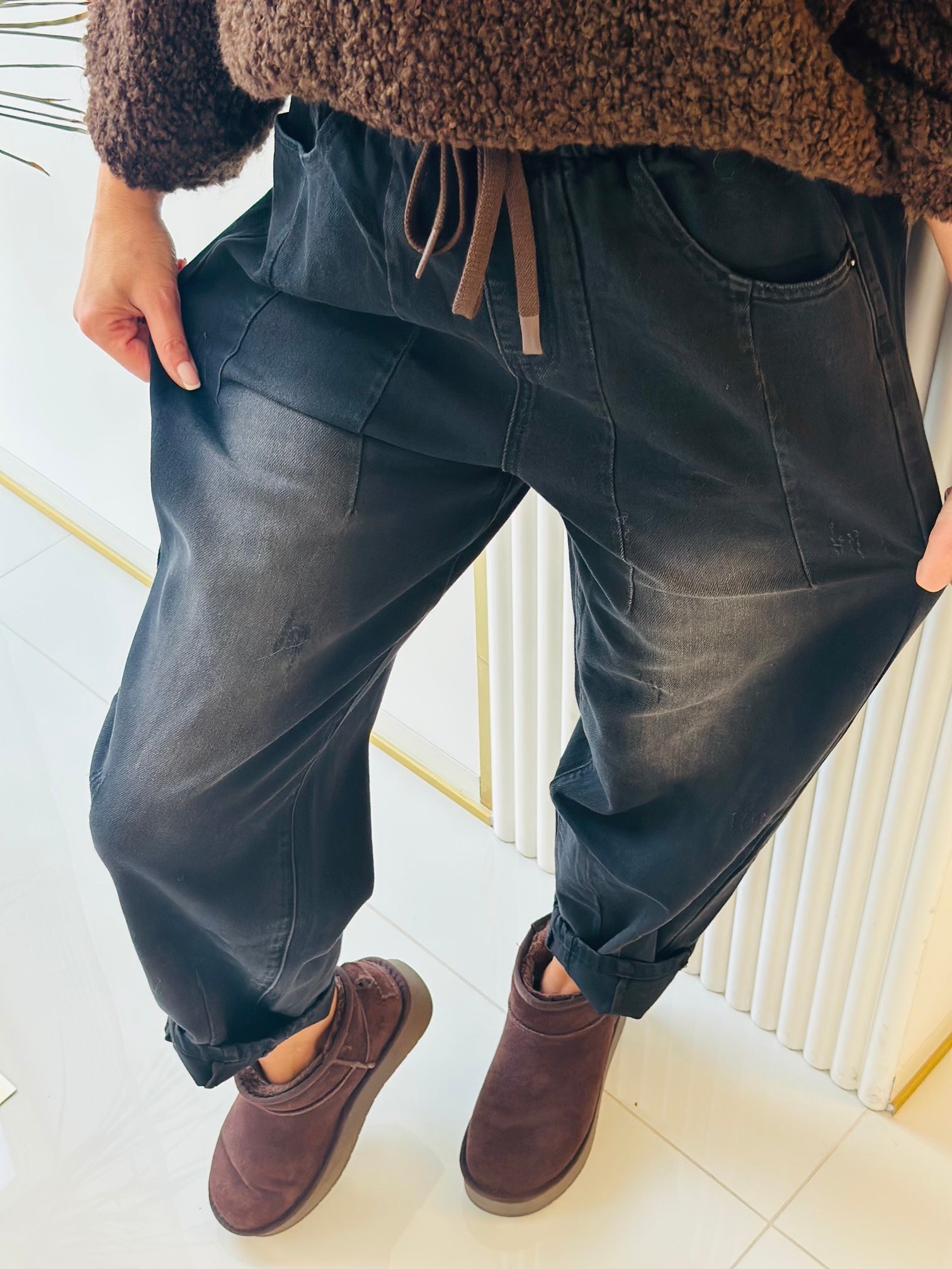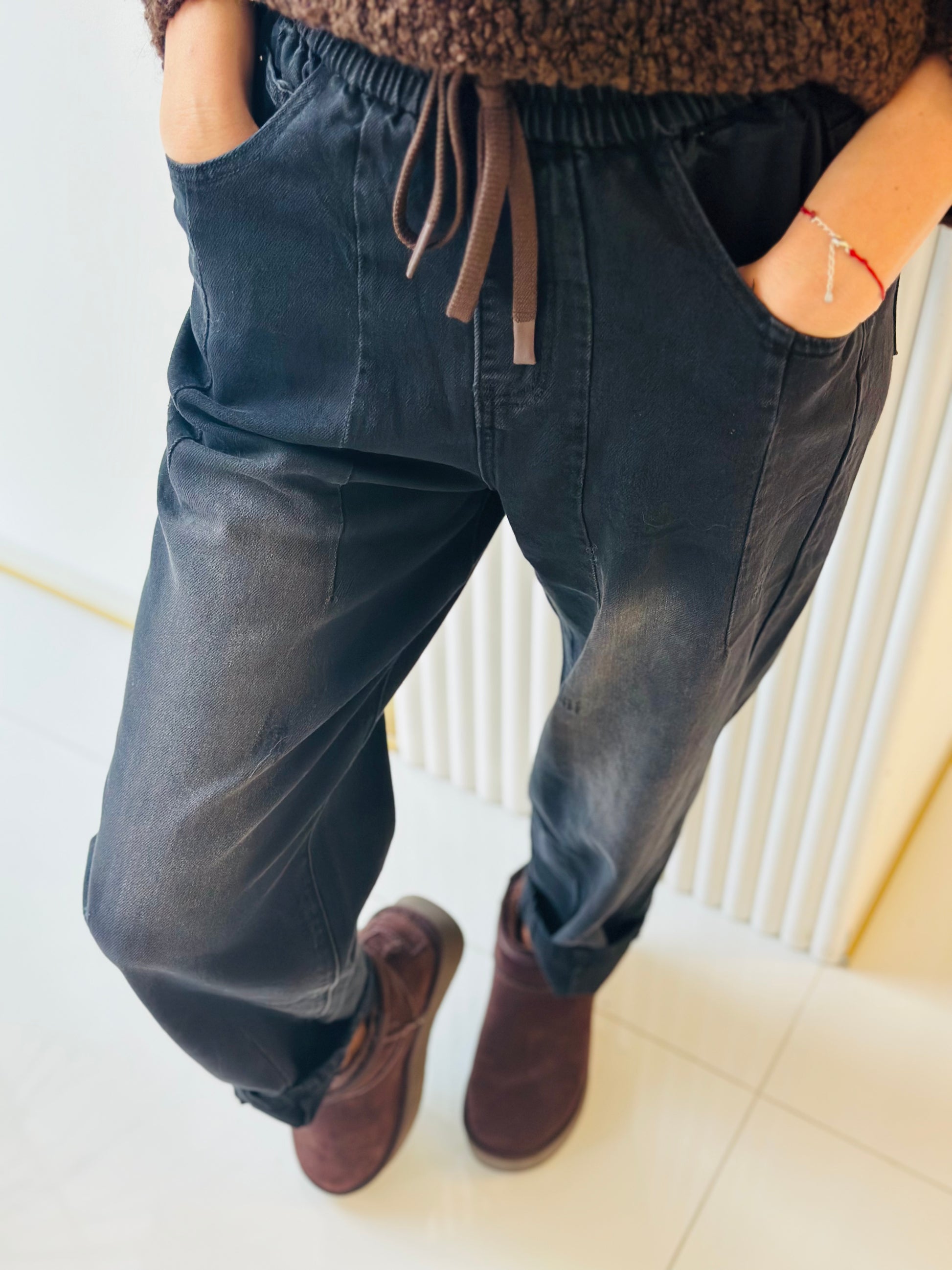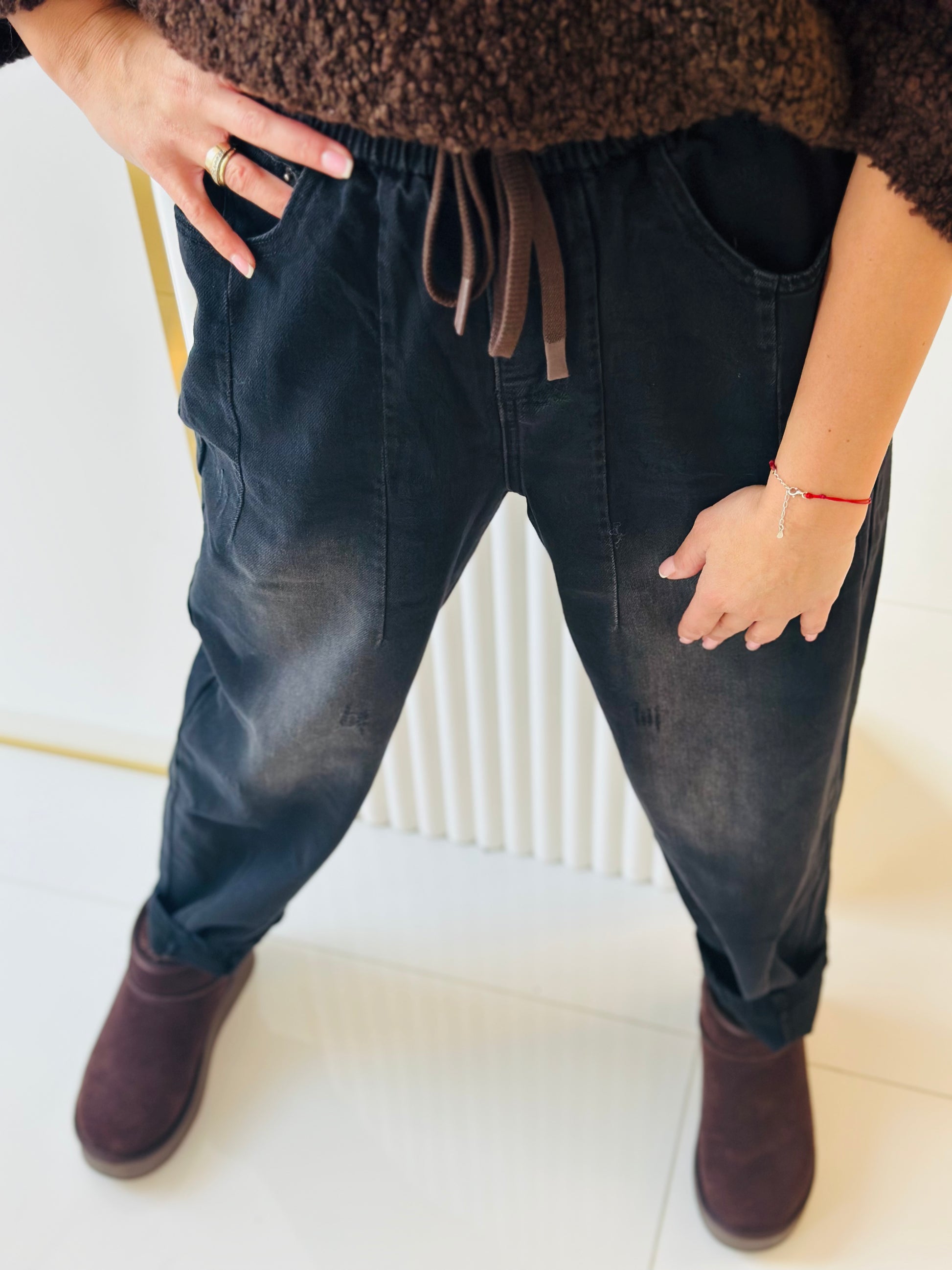 Materiał: Wykonane z miękkiego, sprany materiału w kolorze spranej czerni, z delikatnymi przetarciami.