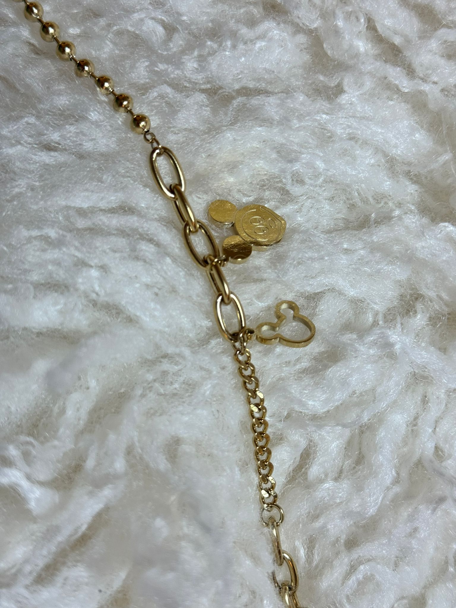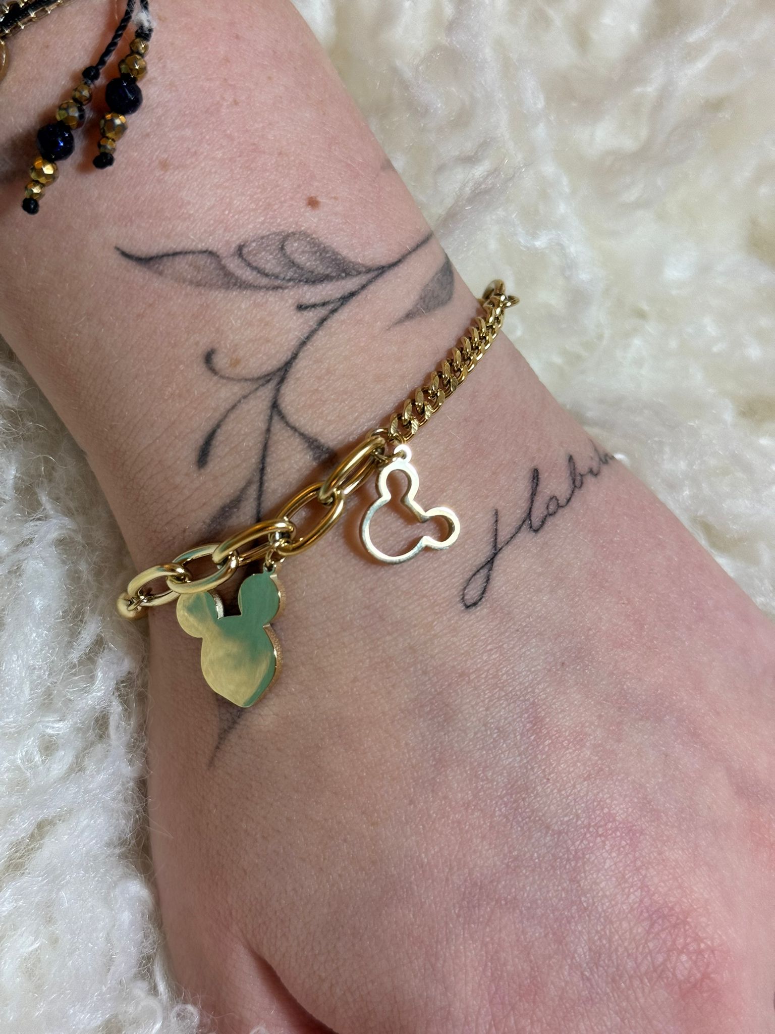 Zawieszki: Głównym elementem dekoracyjnym są dwie zawieszki w kształcie charakterystycznych sylwetek głowy myszki. Jedna z nich to pełna, lśniąca blaszka, natomiast druga ma formę ażurowego konturu, co tworzy ciekawy efekt wizualny.